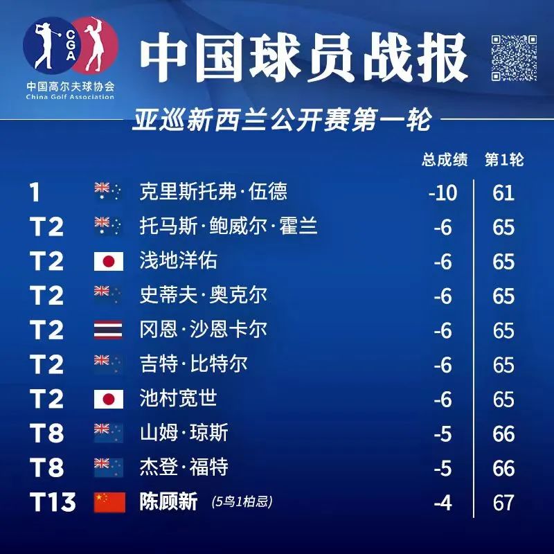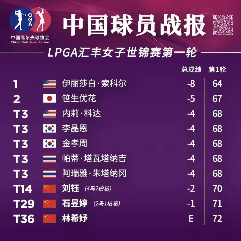 笹生优花(Yuka Saso)抓到5只小鸟,交出零柏忌67杆,排名第二位。6位选手打出68杆,并列位于第三位,其中包括前冠军金孝周以及世界第二内莉-科达。