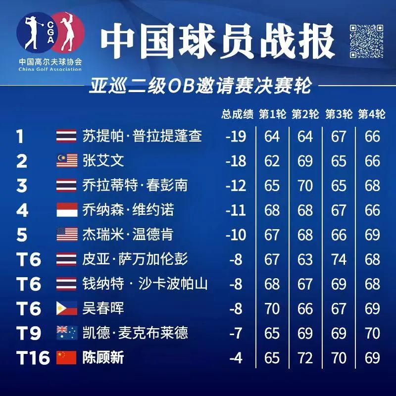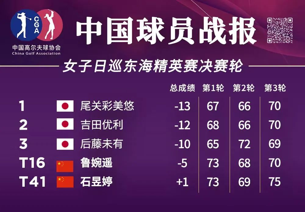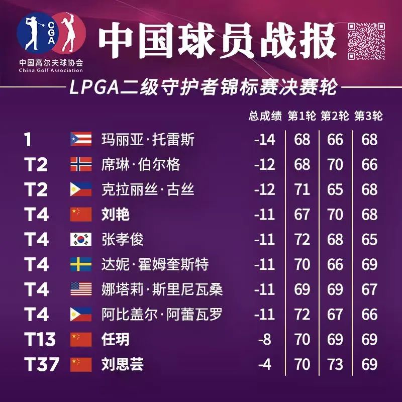殷若宁抓到5只小鸟,吞下2个柏忌,打出69杆,四轮277杆(70-67-71-69),低于标准杆11杆,并列位于15位。刘瑞欣抓到6只小鸟,吞下2个柏忌,打出68杆,四轮279杆(72-68-71-68),低于标准杆9杆,并列位于24位。