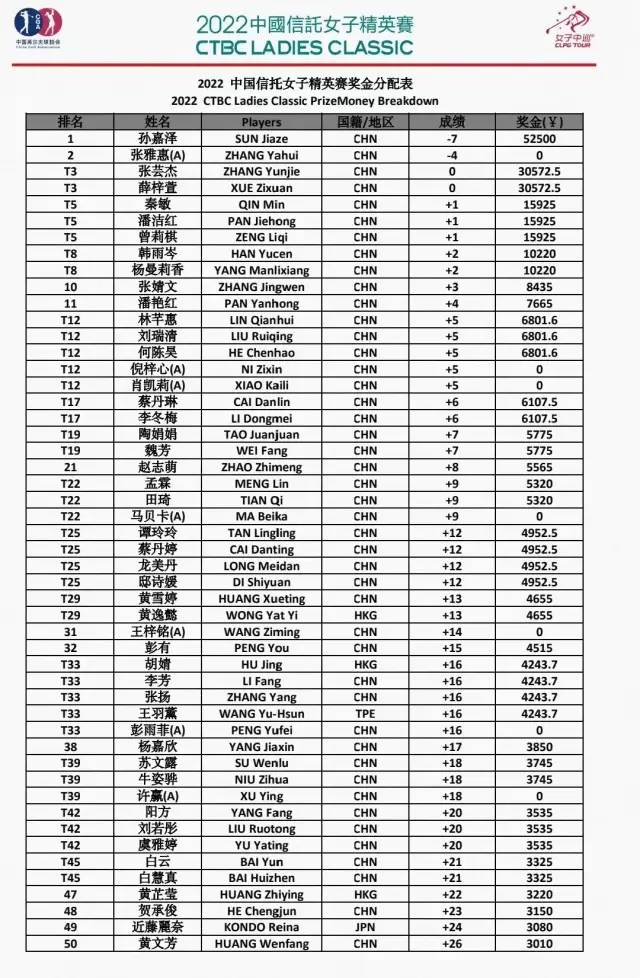 凭借中国信托女子精英赛冠军,孙嘉泽获得52500元冠军支票,升至本赛季奖金榜第三位。