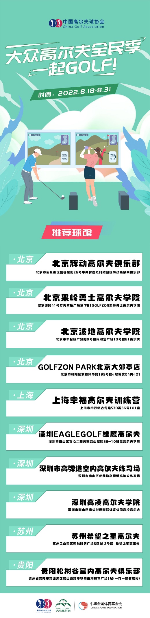 大众高尔夫全民季系列活动除了每周六日的普及课程之外(每周六日,具体活动时间联系球馆获悉),还设置了高尔夫球专业教学指导——“高球小白成长记”,通过三个课时的学习,从高球入门小白更进一步,完成高球小白成长!课程参与者将获得由大众高尔夫颁发的鼓励性证书。高尔夫球专业教学指导将在五个城市的10家重点推荐球馆举办。