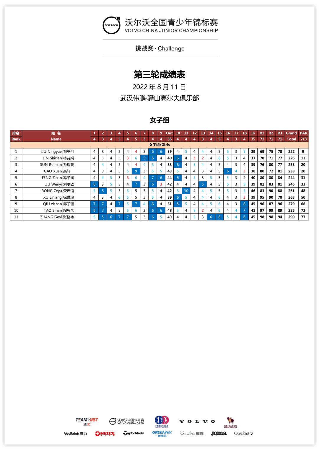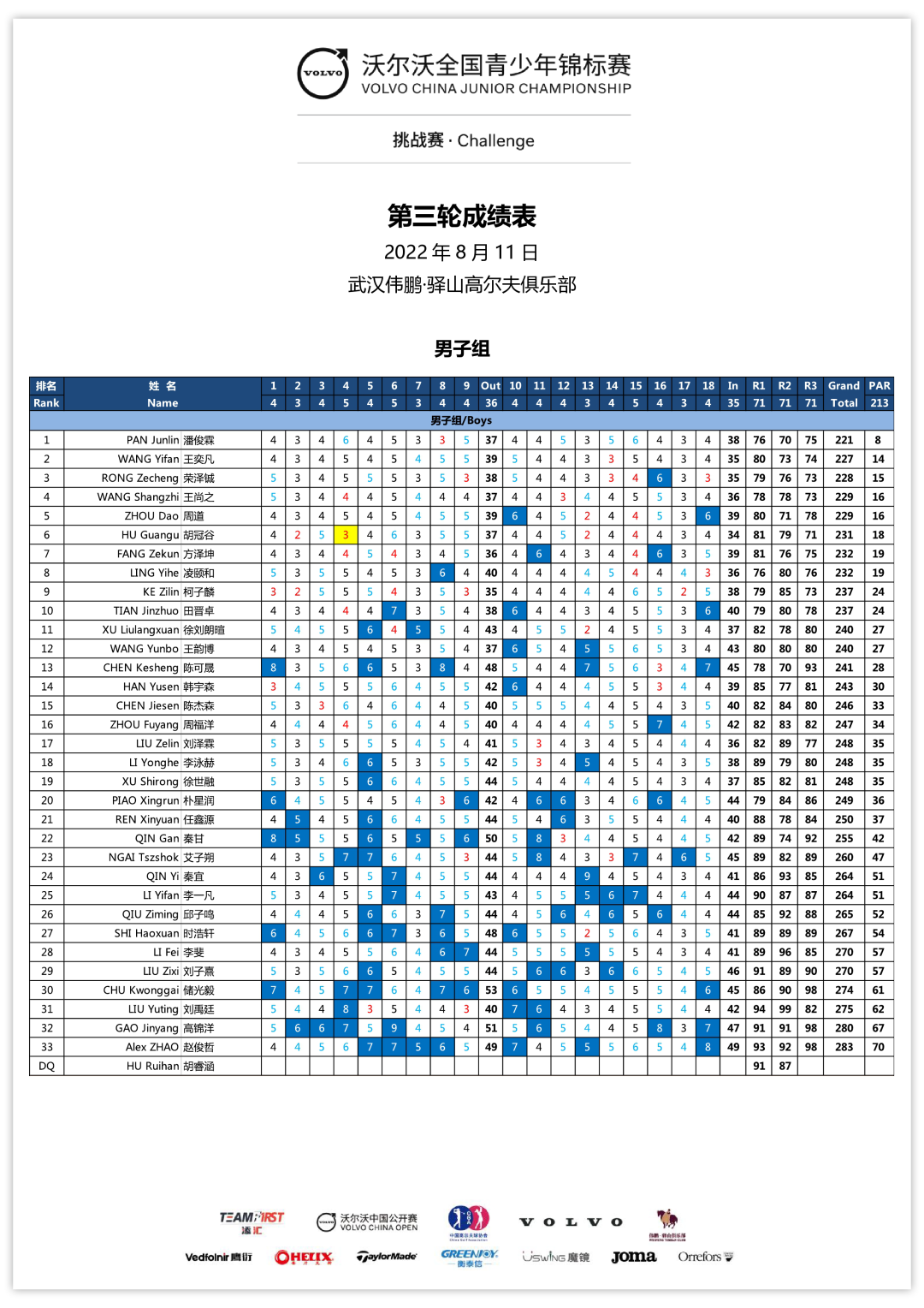 今年三站沃尔沃全国青少年挑战赛至此全部结束,沃尔沃全国青少年比洞锦标赛将于8月30日至9月3日在成都麓山国际乡村俱乐部举行。