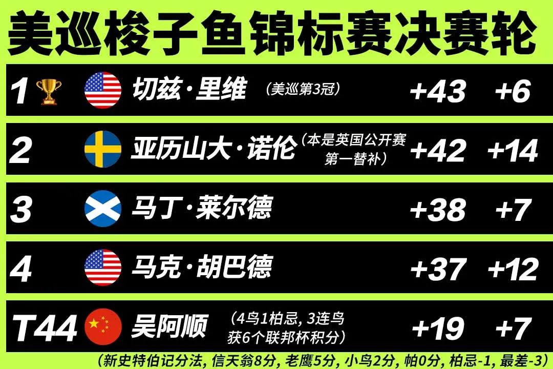 美巡赛梭子鱼锦标赛今年首次得到DP世界巡回赛联合认证,中国名将吴阿顺获得参赛资格。吴阿顺在决赛日打出68杆,收获7分,四轮总获得19分,排名上升到并列44位。