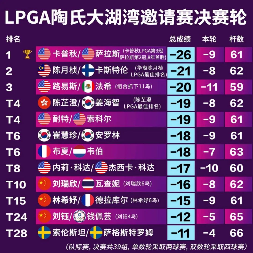 凭借最后一轮61杆(-9)的优秀发挥,国家队员林希妤携手法国选手珀莱恩-德拉库尔,冲到了并列第15位,四轮成绩为265杆(69-66-69-61),低于标准杆15杆。刘钰与中国台北队员钱佩芸搭档,最终以268杆(68-65-70-65),低于标准杆-12杆排名并列第24位。
