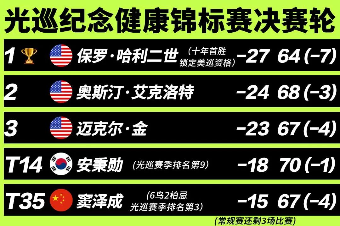 在光辉国际巡回赛纪念健康锦标赛中,中国选手窦泽成在决赛轮连续打出第二轮67杆,最终以269杆(64-71-67-67),低于标准杆15杆,并列位于35位。