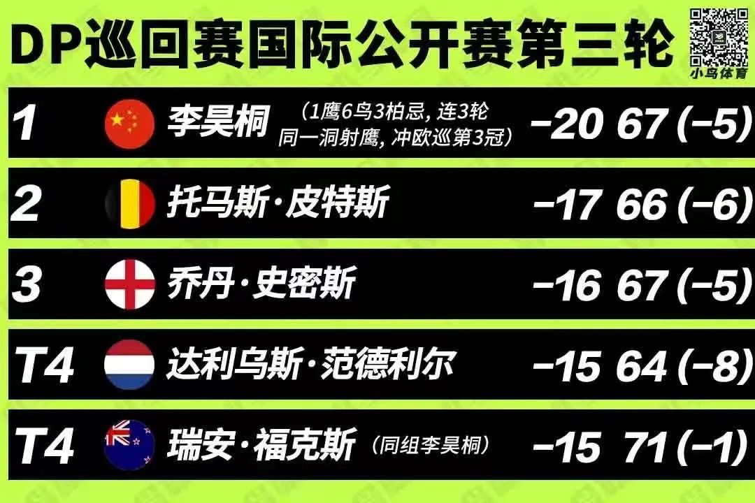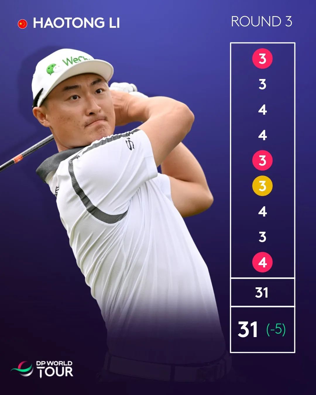 最终,李昊桐以1鹰6鸟3柏忌,-5杆完赛。他三轮后的总成绩为-20杆,排名榜首,领先第二名3杆。