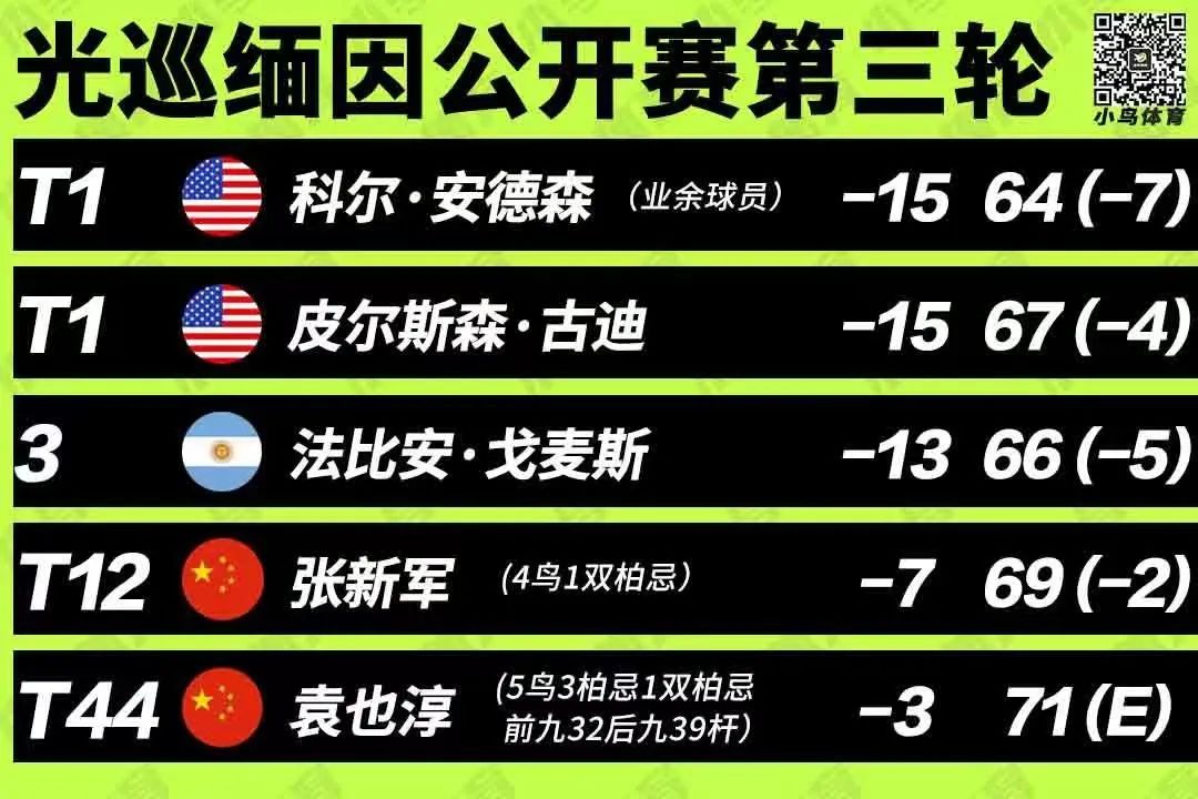北京时间6月26日,光辉国际巡回赛缅因公开赛第三轮争夺结束。中国球员张新军表现优异,他在本轮抓到4只小鸟,吞下双柏忌,最终打出69杆,以三轮206杆(67-70-69),低于标准杆7杆,并列位于12位。