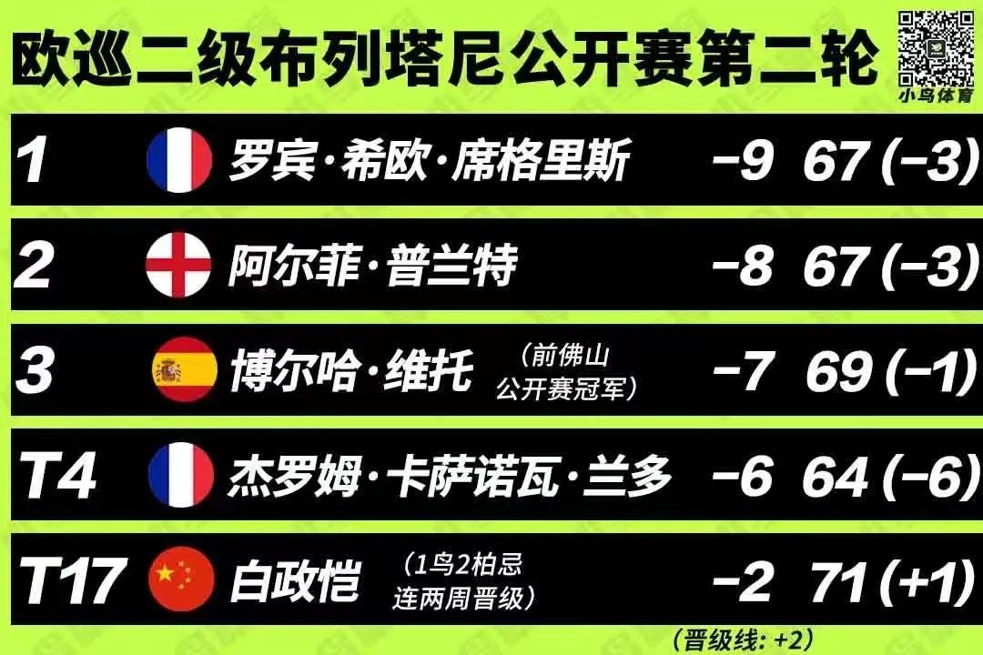 李昊桐继续领跑 北京时间6月25日凌晨,BMW国际公开赛第二轮结束。国家队球员李昊桐凭借单轮-5杆的成绩,以-15杆的总成绩暂时排名榜首。新西兰选手??怂挂砸桓酥罱羲骊煌┲螅械?/span>2。荷兰选手丹恩·霍钦在当地时间上午完赛,目前以总成绩-12杆排名单独第3。 李昊桐是第二比赛日第一组出发的选手,当地时间早晨7:30,昊桐便从1号洞出发,开始了第二轮的征程。本轮,他大部分的得分都发生在前九洞,共打出1鹰4鸟2柏忌。其中,他在五杆洞6号洞连续两天打下老鹰。不同于首轮长达324码的开球,昊桐第二轮在6号洞的开球只有300码,并且将球打到了球道外的长草区。不过他的第二杆仍然将球打到了距离球洞6码的位置,随后他击球得手,完成擒鹰。