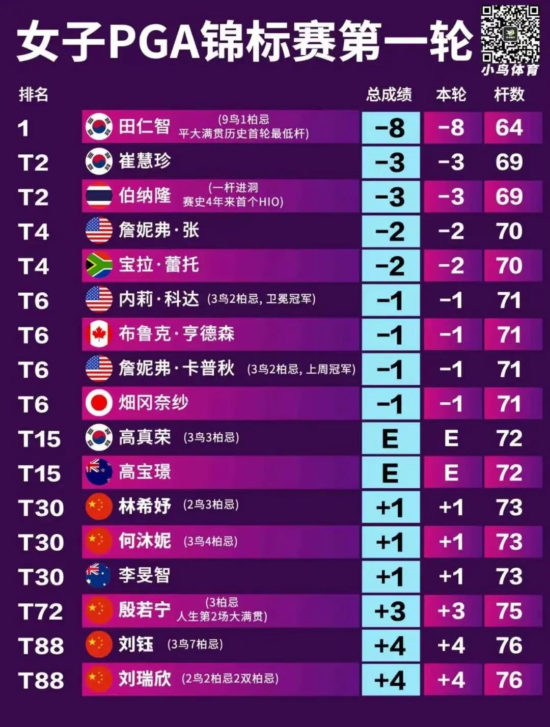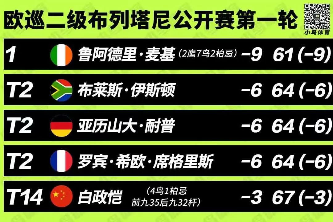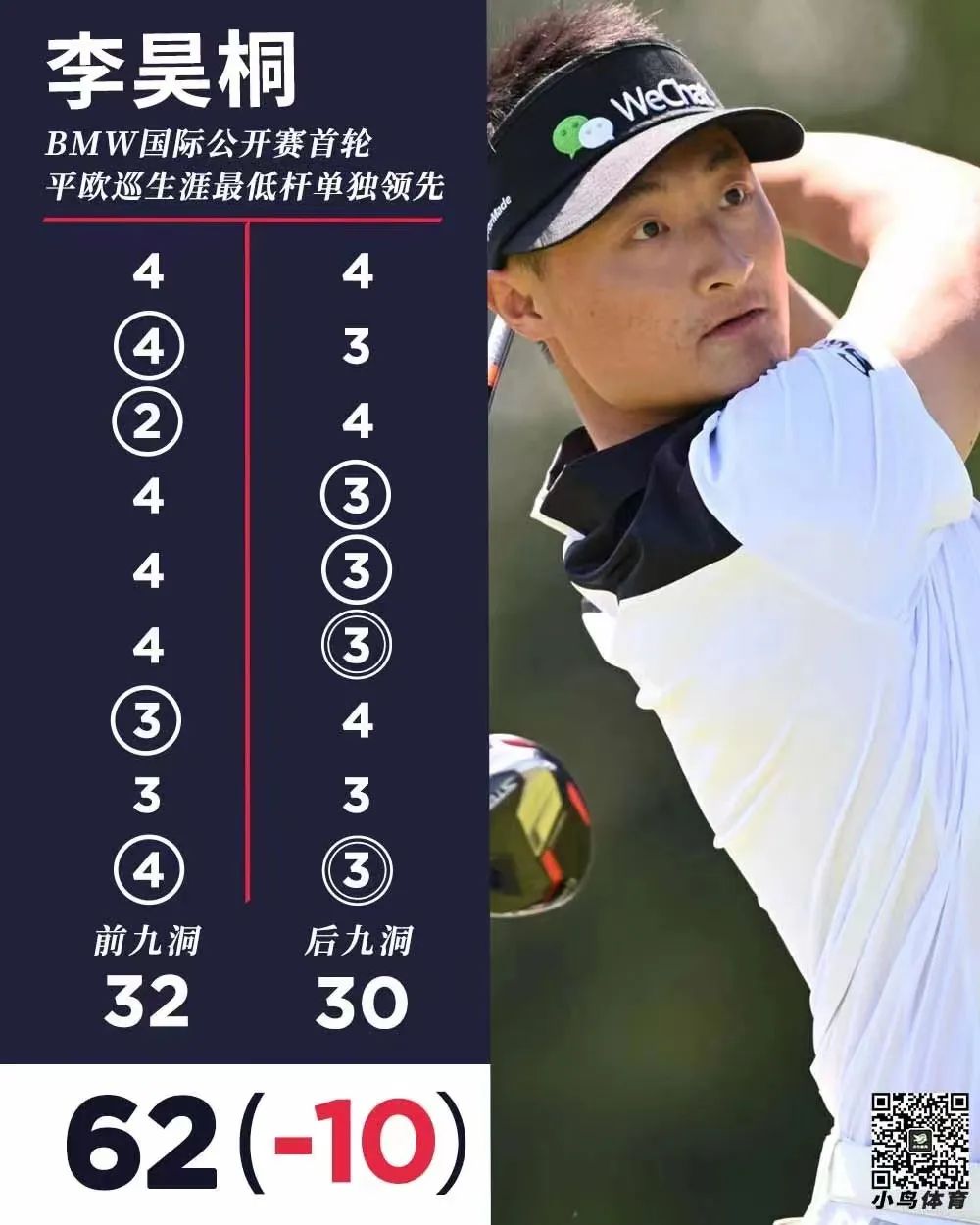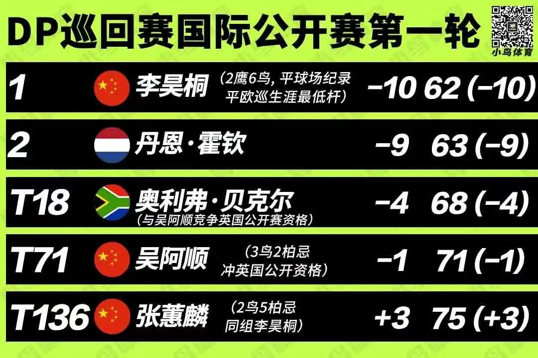 比赛中,这位26岁的两届DP世界巡回赛冠军从后9洞出发,在自己的前半场捉下4只小鸟,转场之后又在4、5号洞连抓2只小鸟。最后四个洞,李昊桐继续发力,分别在6号洞和9号洞擒获两支老鹰,最终以62杆的佳绩排在榜首。