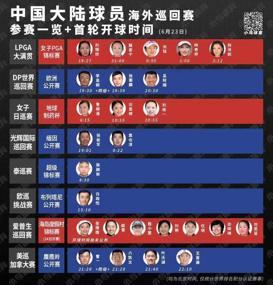 本周,中国高尔夫球又迎来了在海外赛场上全面出击的一周。共有26名中国球员参加包括LPGA大满贯、DP世界巡回赛、光辉国际巡回赛等重要赛事。让我们一起,为中国队加油!