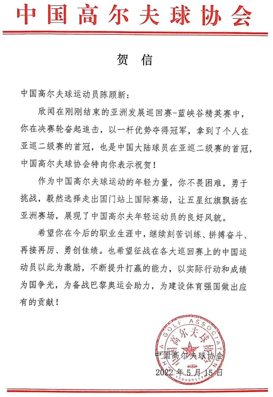 小编按:5月16日,《中国体育报》04版报道中国高尔夫球员陈顾新在高尔夫亚洲发展巡回赛-蓝峡谷精英赛中获胜,成为成为首个赢得亚洲发展巡回赛冠军的中国球员。全文转发如下: