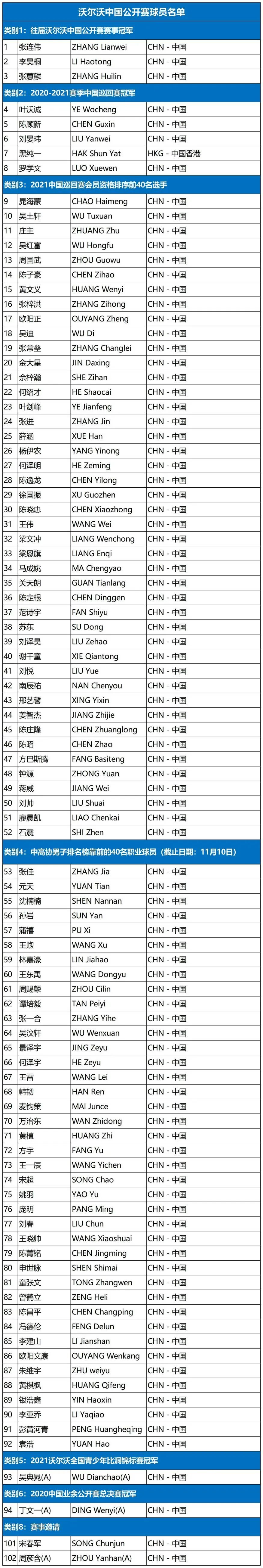 附:2021年沃尔沃中国公开赛球员名单