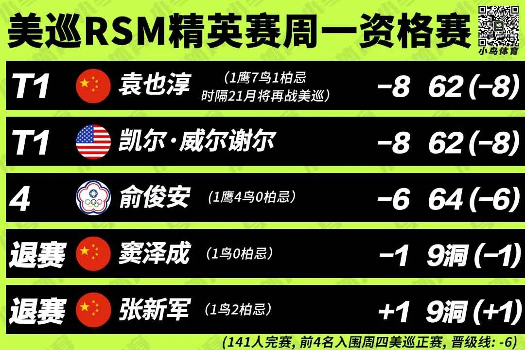 美巡资格赛并列第一,是袁也淳继9月24日陕西全运会斩获男子高尔夫个人金牌之后,时隔8周,再一次在正式比赛中荣膺“冠军”!而在其他中国内地球员方面,窦泽成和张新军、白政恺在完成9洞之后,先后宣布退赛。