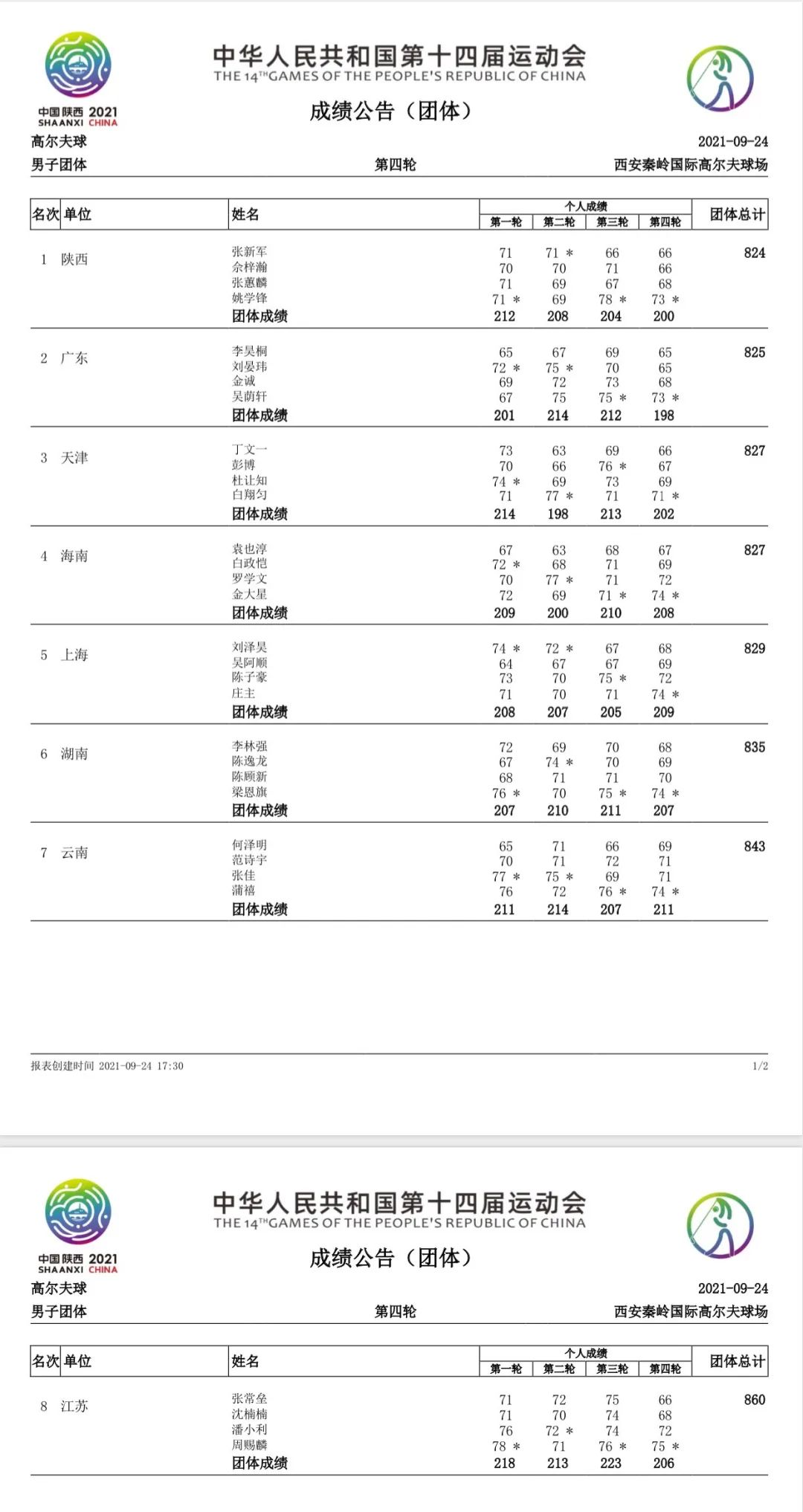 男子团体项目中,由张新军、张蕙麟、佘梓瀚、姚学锋组成的陕西队总成绩824杆(-28),1杆优势实现大逆转,夺得该项目金牌。广东队与天津队分获银牌与铜牌。