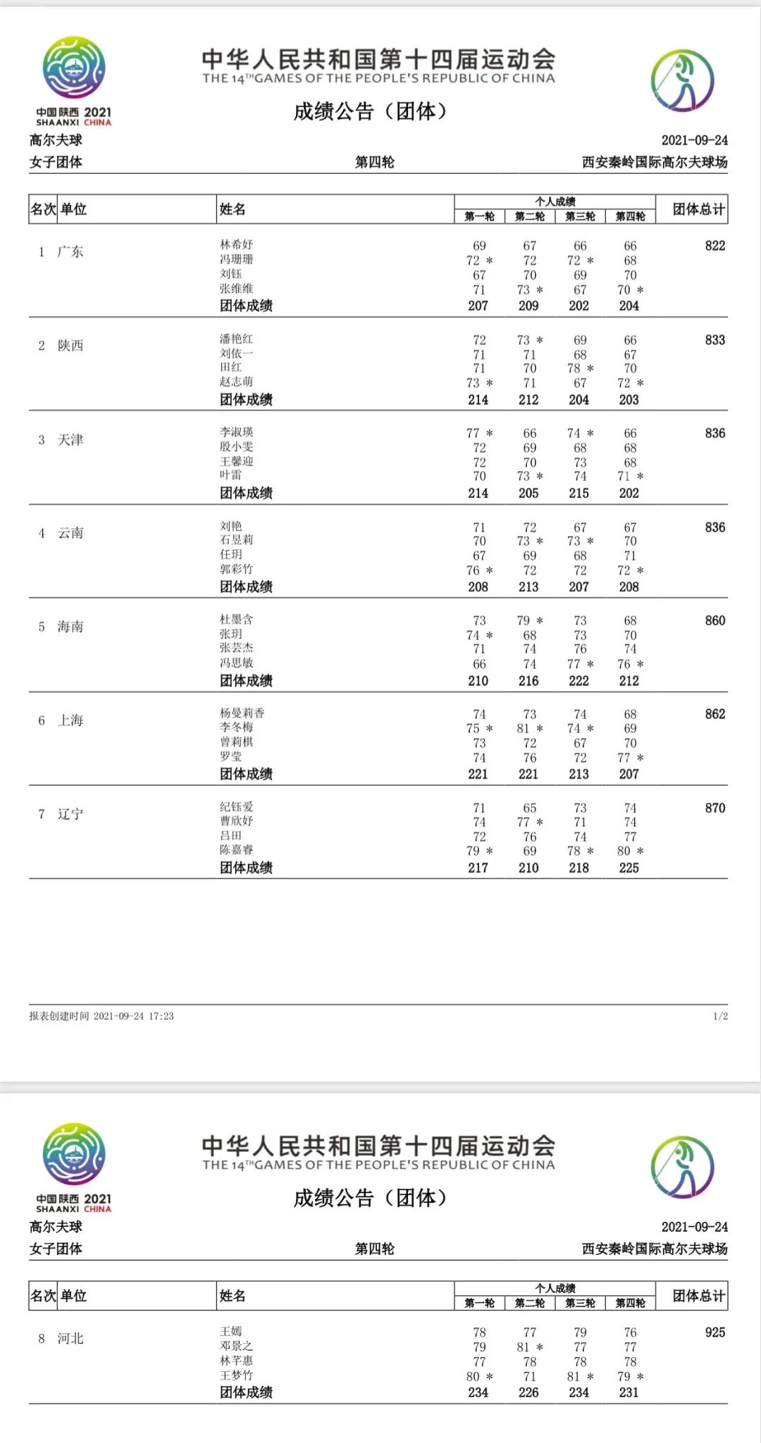 女子团体方面,由林希妤、刘钰、冯珊珊、张维维组成的广东队总成绩822杆(-30),以11杆巨大优势夺冠。陕西队和天津队分获银牌和铜牌。