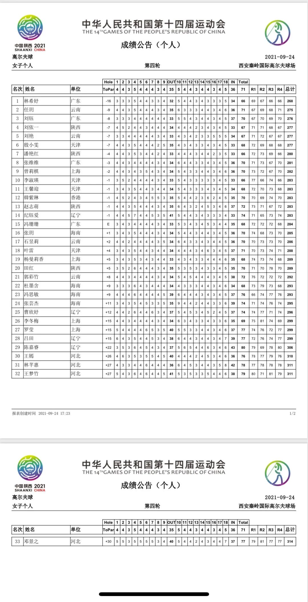 在女子个人项目中,广东队林希妤抓到5只小鸟,包括7号洞的果岭外精彩切进。她交出无柏忌的66杆,总成绩268杆(69-67-66-66),总成绩低于标准杆16杆,以7杆的巨大优势无悬念夺得该项目金牌。