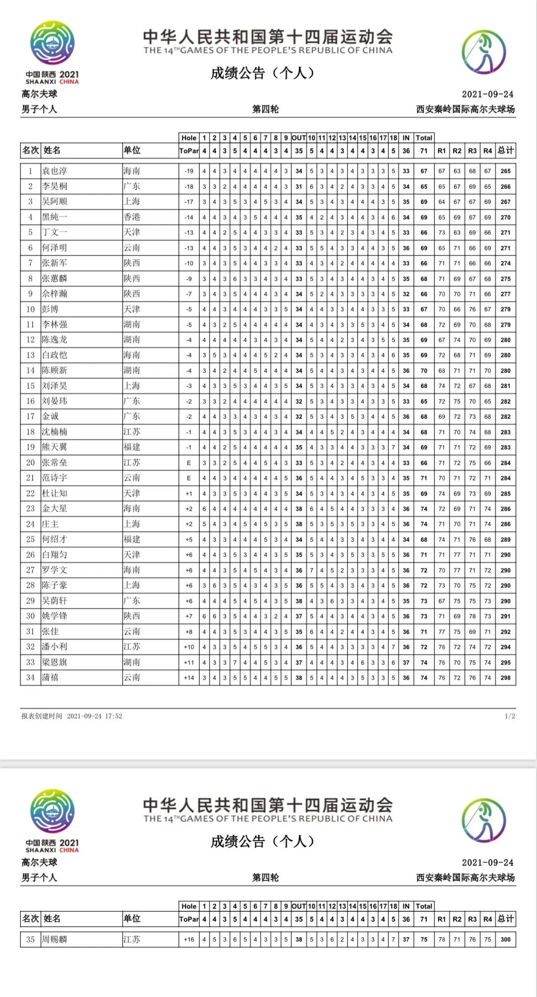 广东队李昊桐交出65杆(-6),总成绩266杆(-18),获得银牌。上海队吴阿顺以69杆(-2)完赛,总成绩267杆(-17)获得铜牌。