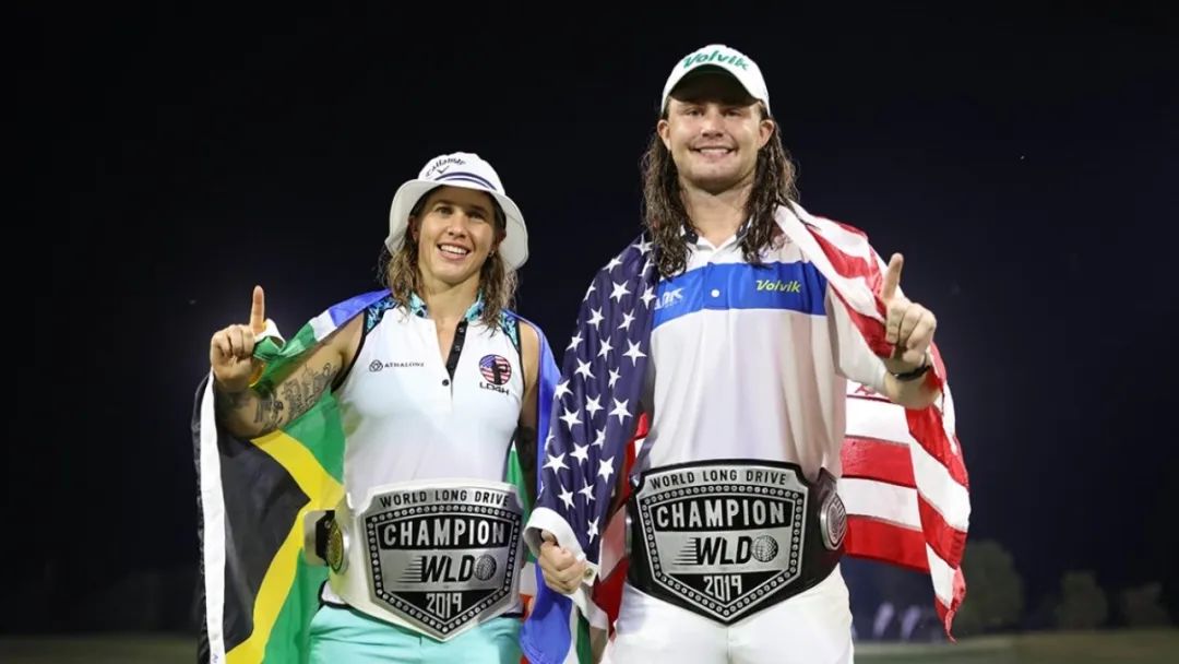 世界长打王女子组冠军Chloe Garner(南非)与男子组冠军Kyle Berkshire(美国)合影