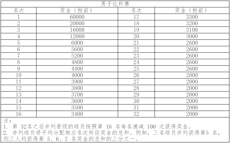 (一)总奖金为20万元人民币,业余身份选手不获得奖金,具体分配方式如下表:
