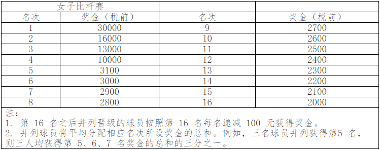 (一)总奖金为10万元人民币,业余身份选手不获得奖金,具体分配方式如下表: