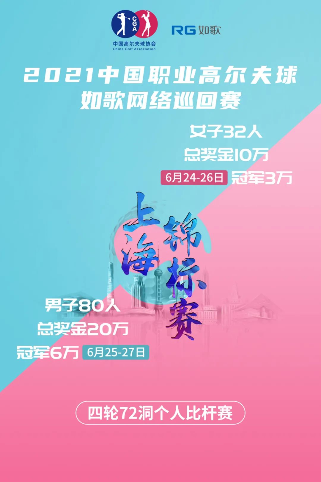根据赛程计划,2021中国职业高尔夫球-如歌网络巡回赛上海锦标赛将于6月24日启动,首先开杆的是32人阵容的女子比杆赛--上海女子锦标赛,总奖金10万元,冠军将获得3万元;80人阵容的男子比杆赛--上海男子锦标赛紧接着在6月25日开赛,总奖金20万元,冠军将获得6万元。两场比赛的决赛将先后于26、27日在上海举行。