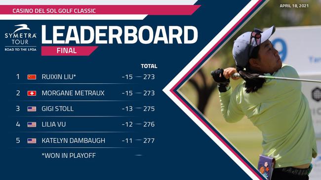 北京时间4月19日,亚利桑那时间星期日,22岁的中国姑娘刘瑞欣在塞维洛高尔夫俱乐部(Sewailo Golf Club)最后四个洞抓到4只小鸟,与瑞士选手摩根-梅特罗(Morgane Metraux)一道进入延长赛,之后在第二个加洞抓鸟,赢得太阳赌场高尔夫精英赛。