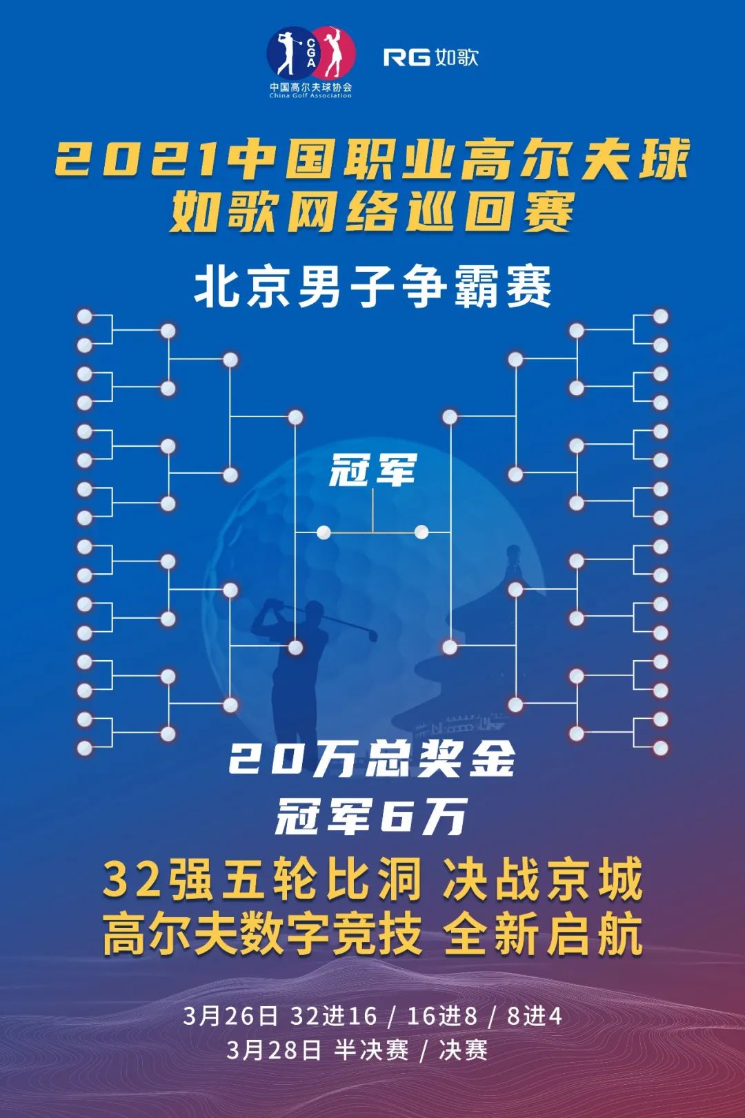 根据赛程计划,2021中国职业高尔夫球-如歌网络巡回赛将于325日启动,首先开杆的是16人阵容的女子比洞赛--北京女子争霸赛,总奖金10万元,冠军将获得3万元;32人阵容的男子比洞赛--北京男子争霸赛紧接着在326日开赛,总奖金20万元,冠军将获得6万元。两场比赛的半决赛和决赛将先后于2728日在北京举行。