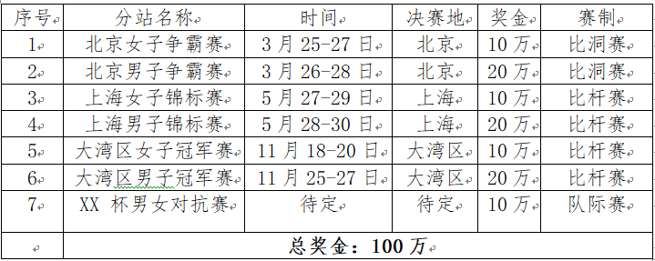 (一)女子赛单站总奖金为10万元人民币,男子赛单站总奖金为20万元人民币,业余身份选手不获得奖金,奖金分配表见附件1