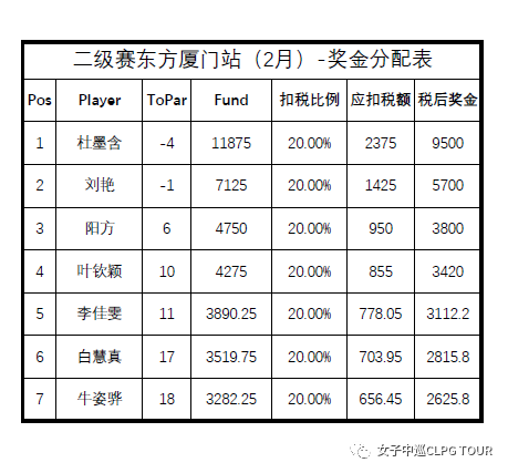 北京时间2月24日,女子中巡二级赛测试赛厦门站圆满落幕。职业球手杜墨含以总成绩140杆(69-71)摘得牛年第一冠,男子业余球手陈鑫达以总成绩141杆(73-68)获得亚军。