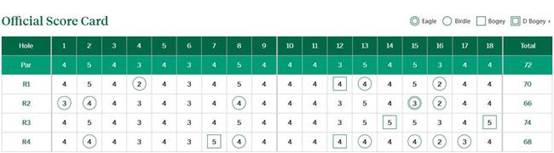 北京时间11月16日,中国台北选手潘政琮的美国大师赛首秀等待的时间明显很久。可是这个等待是值得的。星期天,他在奥古斯塔打出68杆,四轮交出278杆(70-66-74-68),低于标准杆10杆,确保了一个前十名。