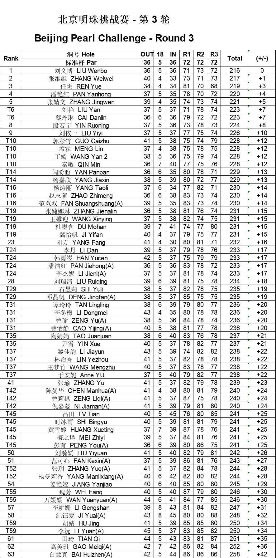 星期五,刘文博交出72杆,三轮成绩为216杆(71-73-72),平标准杆。这是2018年CLPGA铁岭龙山高尔夫挑战赛罗莹打出222杆,高于标准杆6杆,取得2杆胜利以来,女子中巡第一次胜利杆数没有在标准杆之下。
