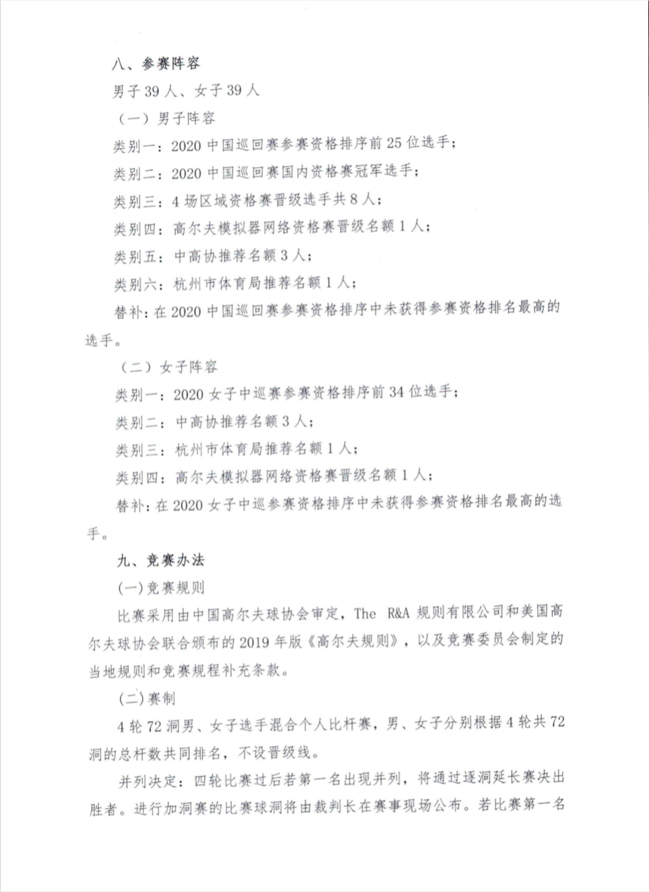 2020杭州国际锦标赛将是一场小阵容的国内顶尖男、女子职业赛,赛事总奖金120万人民币,78位男、女球员将同场竞技,通过4轮72洞个人比杆赛,争夺男、女混合个人赛冠军。这将是世界各大职业高尔夫球巡回赛的官方赛事中首次采用男、女混合个人赛的赛制,这种创新的赛制也得到了男、女两大世界高尔夫球积分组织的认可,排名靠前的男、女球员(男子前6、女子至少前14)都将获得世界积分,并计入2020东京奥运会高尔夫项目资格排名,助力中国球手圆梦奥运。