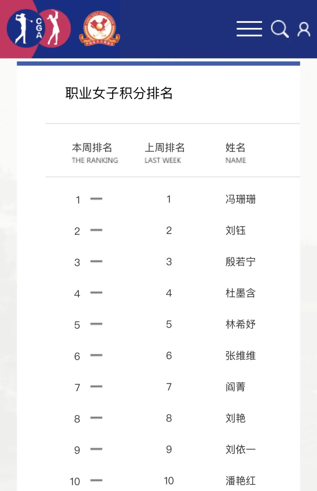以下在世界榜上中国内地排名前十的选手:(1)冯珊珊(24),(2)刘钰(42),(3)阎菁(90),(4)林希妤(99),(5)张维维(186),(6)鲁婉遥(231),(7)刘艳(243),(8)杜墨含(244),(9)石昱婷(279),(10)刘瑞欣(302)。