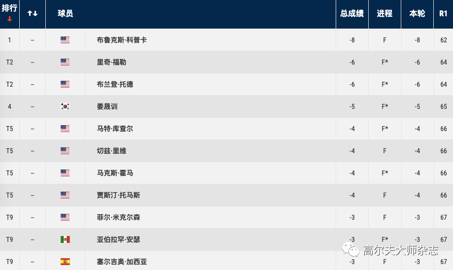 北京时间7月31日,世锦赛-圣裘德邀请赛在TPC南风球场结束首轮争夺。卫冕冠军布鲁克斯·科普卡交出9鸟1破击的62杆,以2杆优势单独制霸领先榜,有望下周PGA锦标赛前冲击个人赛季首胜。同时,这一杆数也是他个人职业生涯最低杆纪录。