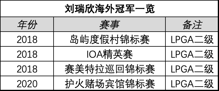 而4座奖杯的傲人履历,也让刘瑞欣在仅仅21岁的年龄,就成为中国高尔夫海外冠军数高居并列第4位的球手。