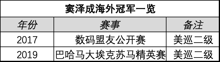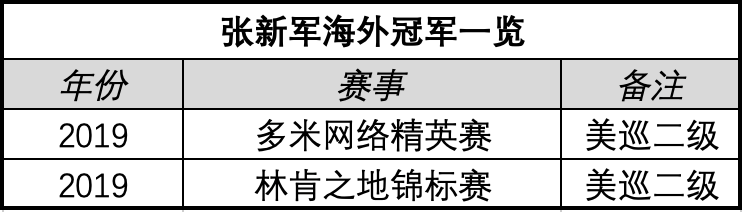 历经美巡赛三级-二级-一级-二级的起落沉浮,张新军在2019年光辉国际巡回赛终于爆发,8周内勇夺两冠。其中6月林肯之地锦标赛的冠军,让他在常规赛结束前两个月,就早早锁定回归美巡赛的参赛卡到手,奠定了本赛季在美巡舞台以多场前十名打出气势的基础。