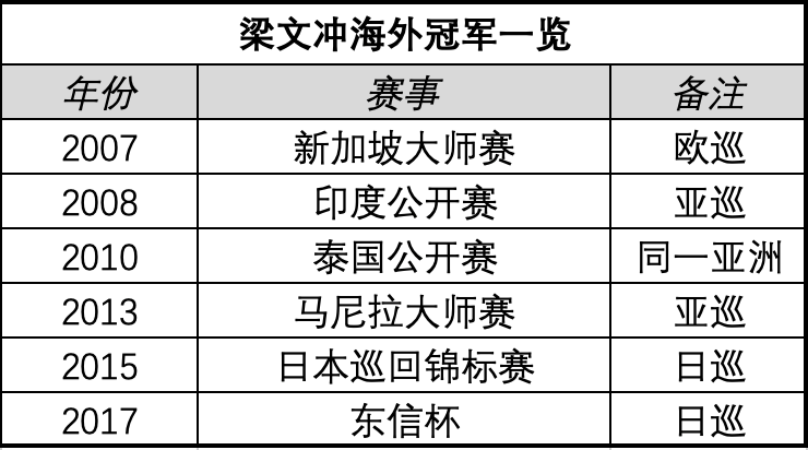 2007年,在用一系列冠军统治国内高坛之后,28岁的梁文冲迈出国门,同样在新加坡,同样是新加坡大师赛,2007年,他再现了四年前张连伟夺冠的一幕,加洞赛力克马来西亚球员延安·斯蒂尔,成为了第二位赢得欧巡赛冠军的中国内地球员。