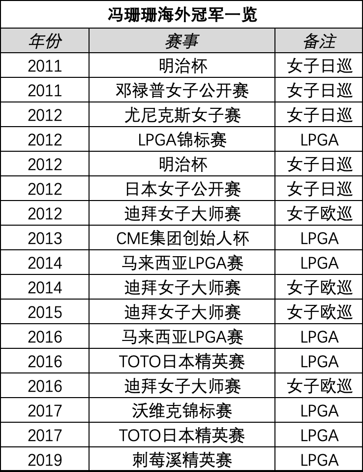 世界第一、大满贯得主、奥运奖牌、10座LPGA冠军、7座女子日巡冠军、7座女子欧巡冠军……无论从荣誉还是奖金,冯珊珊都毫无疑问是迄今中国内地最成功的高尔夫球员。