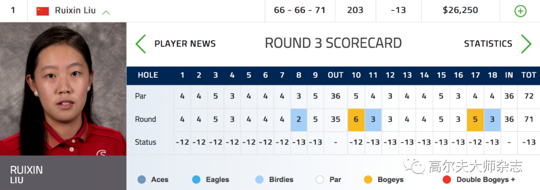连续两轮交出66杆后,刘瑞欣以3杆优势开始决赛轮的争夺。全场抓到3只小鸟,吞下两个破击,以71杆(-1)完成比赛。总成绩203杆(-13),一路平稳捧起冠军奖杯。