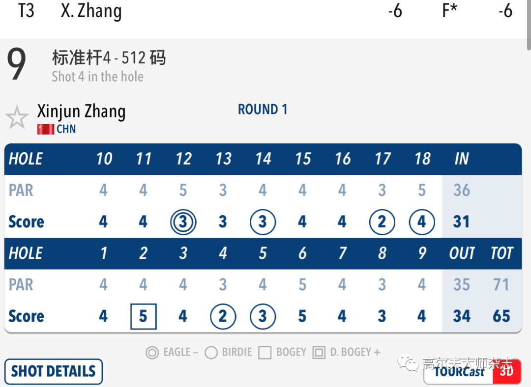 来到后九,张新军在标准杆4杆的第2洞吞下全场唯一破击,又在第4洞和第5洞入账背靠背小鸟。最终交出65杆(-6),排在并列第3位。