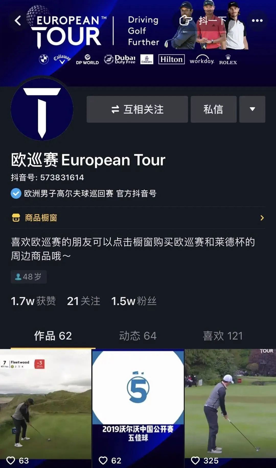 抖音直播平台:中国高尔夫、大众高尔夫-CGA、沃尔沃中国公开赛、如歌高尔夫、欧巡赛European Tour