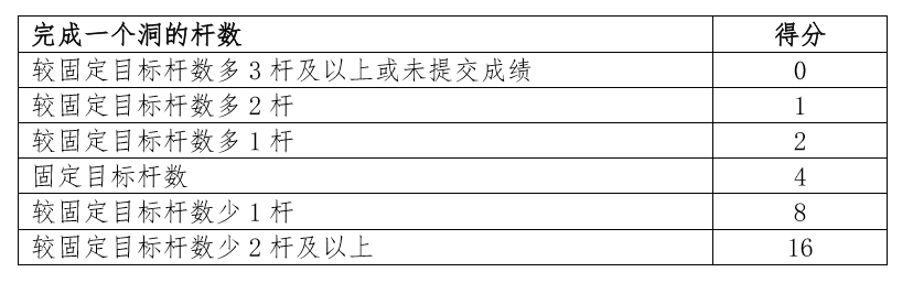 - 定分式比赛采用《规则》第21条定分式比赛规则,通过比较运动员或者运动员所在的一方在该洞的杆数和当地球场为该洞设定的目标杆数得出,完成该轮比赛后得分最多的一方获胜。评分标准如下: