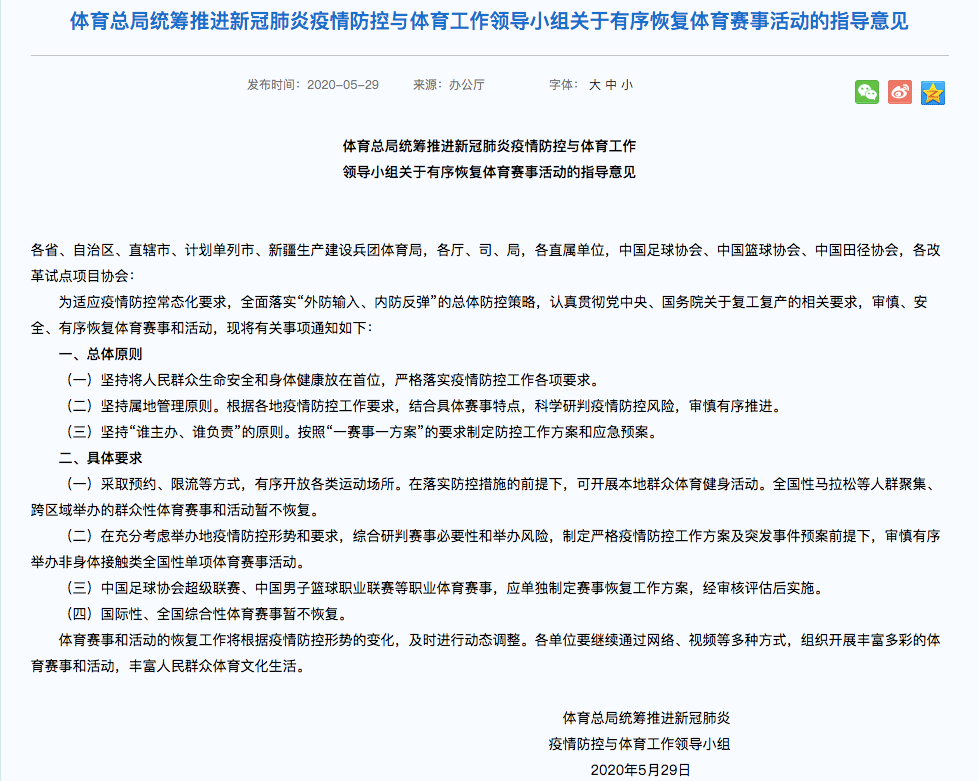 5月29日,国家体育总局发布有序恢复体育赛事活动的指导意见,在明确全国性马拉松等人群聚集、跨区域举办的群众性体育赛事和活动,国际性、全国综合性体育赛事暂不恢复,以及中超、CBA等职业体育赛事,单独制定赛事恢复工作方案之外,意见指出“在充分考虑举办地疫情防控形势和要求,综合研判赛事必要性和举办风险,制定严格疫情防控工作方案及突发事件预案前提下,审慎有序举办非身体接触类全国性单项体育赛事活动。”
