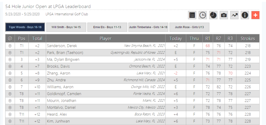 本站比赛中,马秉文参加了Tiger Woods- Boys 16-18组别的角逐。尽管14岁的小马是全场年龄最小的运动员,但他不畏强敌,在比赛中发挥出色,前两轮后以71-71领先的成绩进入到第三轮争冠。