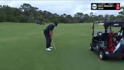 6个超级碗冠军得主汤姆-布雷迪在前六个洞很挣扎,球打得到处都是,可是第七洞终于打出了精彩的一杆,在球道上直接击球进洞抓到小鸟。