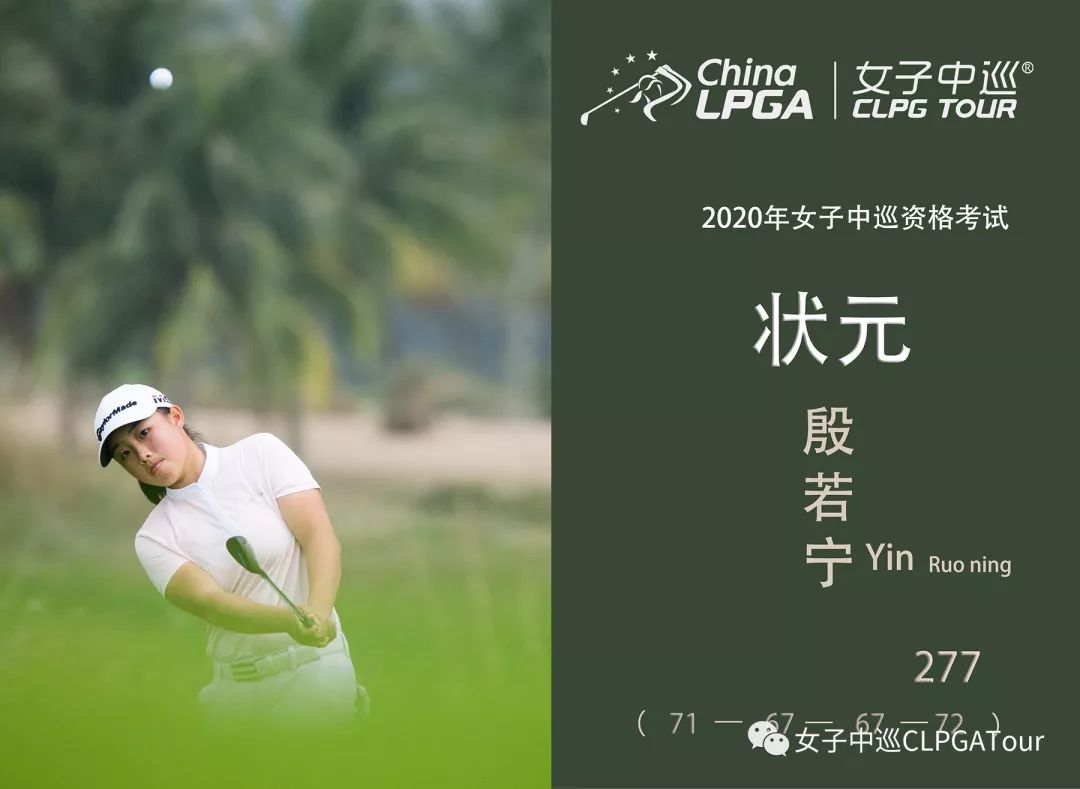 北京时间1月18日,2020年中国女子职业高尔夫球巡回赛资格考试于中海神州高尔夫球会顺利落幕。经过四轮激烈的交战后,中国业余小将殷若宁以四轮277杆(71-67-67-72),低于标准杆11杆的成绩荣获2020年女子中巡资格赛状元!