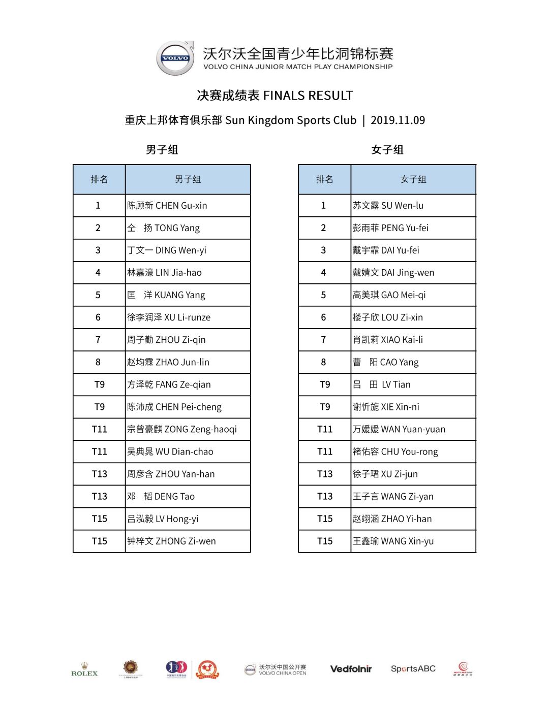 自此,由中国高尔夫球协会主办、铭泰高尔夫承办的第15届沃尔沃全国青少年比洞锦标赛圆满落幕。冠军陈顾新获得明年沃尔沃中国公开赛参赛资格;苏文露获得一场中国女子职业高尔夫球巡回赛(CLPGA)外卡资格。除此之外,沃尔沃全国青少年比洞锦标赛男子、女子第2-3名获邀参加2020年沃尔沃中国公开赛职业业余配对赛、赛事欢迎晚宴、赛事球员教学活动。
