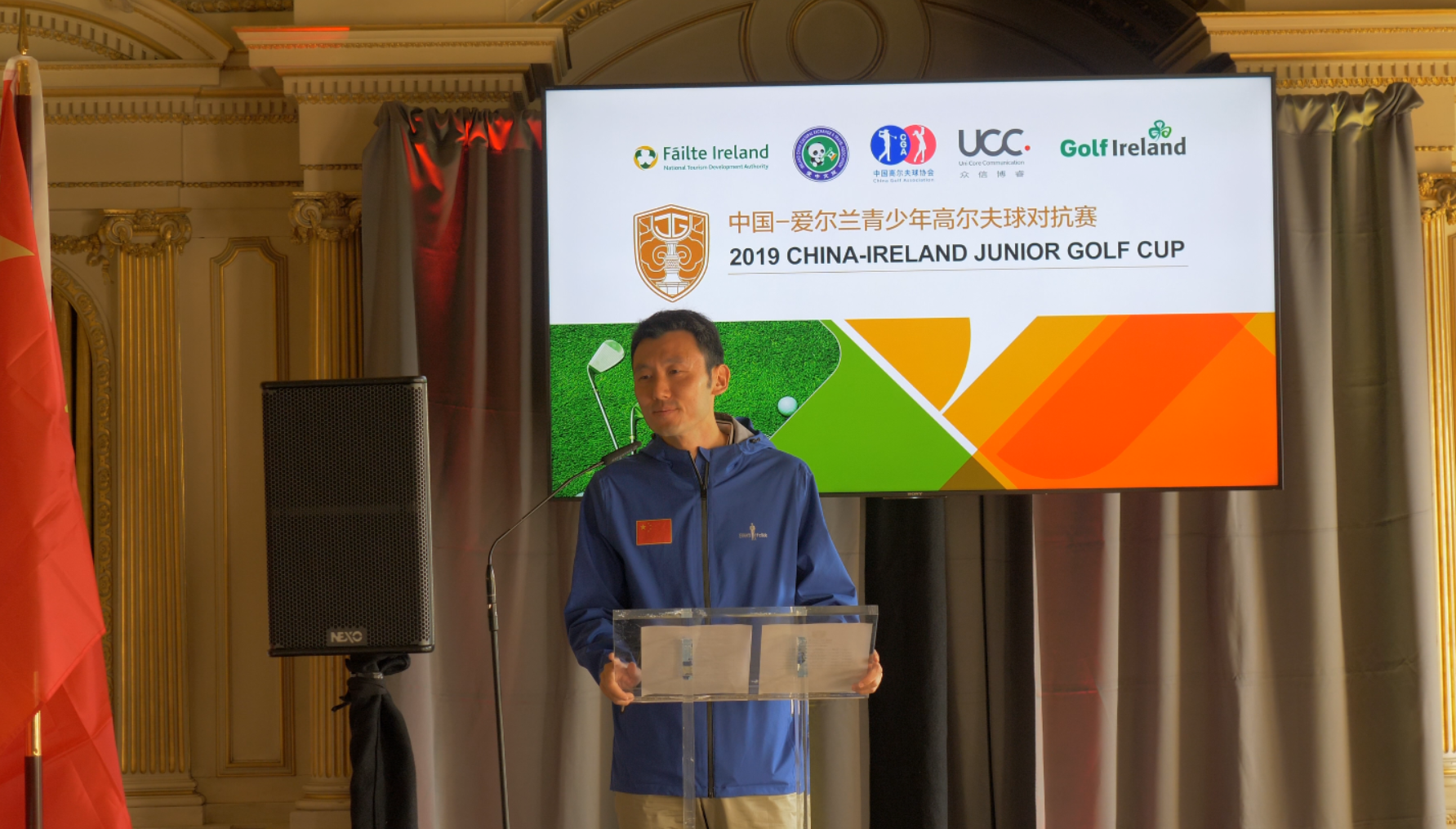 赛事合作承办单位——爱尔兰国家旅游发展局商务发展部的Ciaran Mcloone先生在仪式上致辞。他首先代表爱尔兰国家旅游发展局表达了对中方参赛队员到来的感谢和欢迎,Ciaran说,爱尔兰是世界著名的高尔夫球圣地,爱尔兰山峦起伏的地形和翡翠碧绿的广阔草地造就了众多世界一流的高尔夫球场,爱尔兰国家旅游发展局希望远道而来的中国球员能够在两天赛事中享受爱尔兰优美的自然风光和淳朴的当地民俗风情。