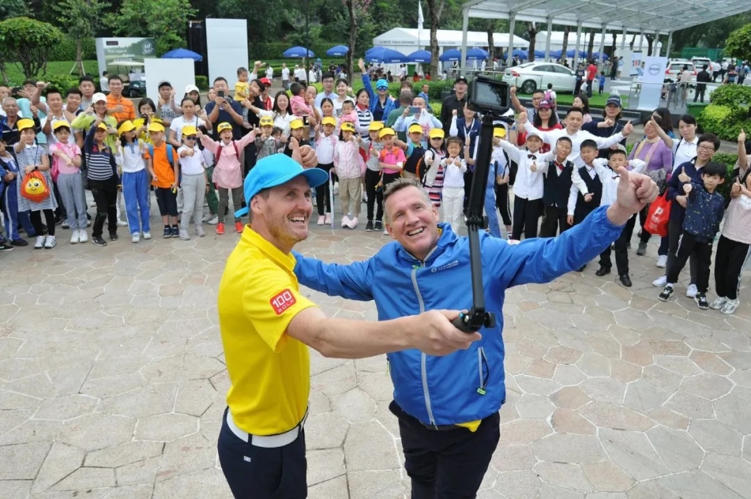 公众活动区的迷你高尔夫体验游戏,让黄埔学校助威团的学生们大呼过瘾。来自英国的斯维恩(Geoff Swain)和卡彭特(Kevin Carpenter)这对“花式高尔夫兄弟”大秀高球特技,更是叫让孩子们流连忘返。