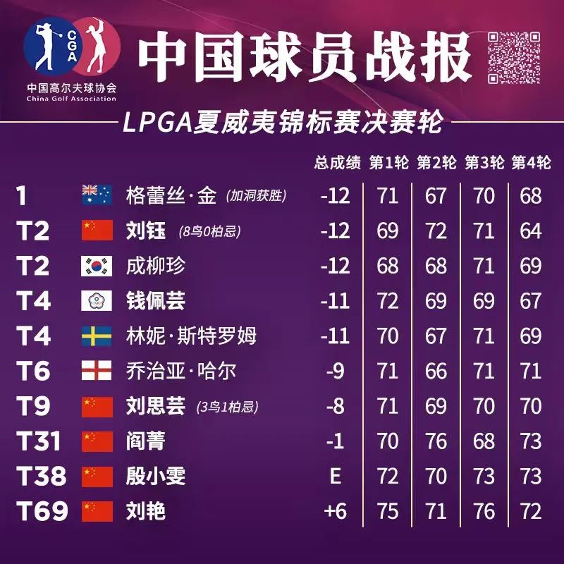 北京时间4月16日,中国球员刘钰在LPGA夏威夷锦标赛决赛轮上演的延长赛中不敌澳大利亚选手格蕾丝-金(Grace Kim),取得并列第二名。刘钰最后一轮发挥出色,打出64杆,低于标准杆8杆,从并列15位冲到了领先榜首位。她的四轮成绩为276杆(69-72-71-64),低于标准杆12杆。领先组出发的外卡选手成柳珍和格蕾丝-金在最后一个洞抓鸟,分别打出69杆和68杆,追平了刘钰。三位选手重新回到18号洞,五杆洞打延长赛。延长赛中,刘钰20英尺小鸟推未能成功,格蕾丝-金抓到小鸟取得胜利。第二名,这是自2019年3月LPGA奠基人杯并列第二以来,刘钰在女子美巡赛上获得的最好名次。中国球员刘思芸连续交出70杆,四轮成绩为280杆(71-69-70-70),低于标准杆8杆,并列位于第九位。