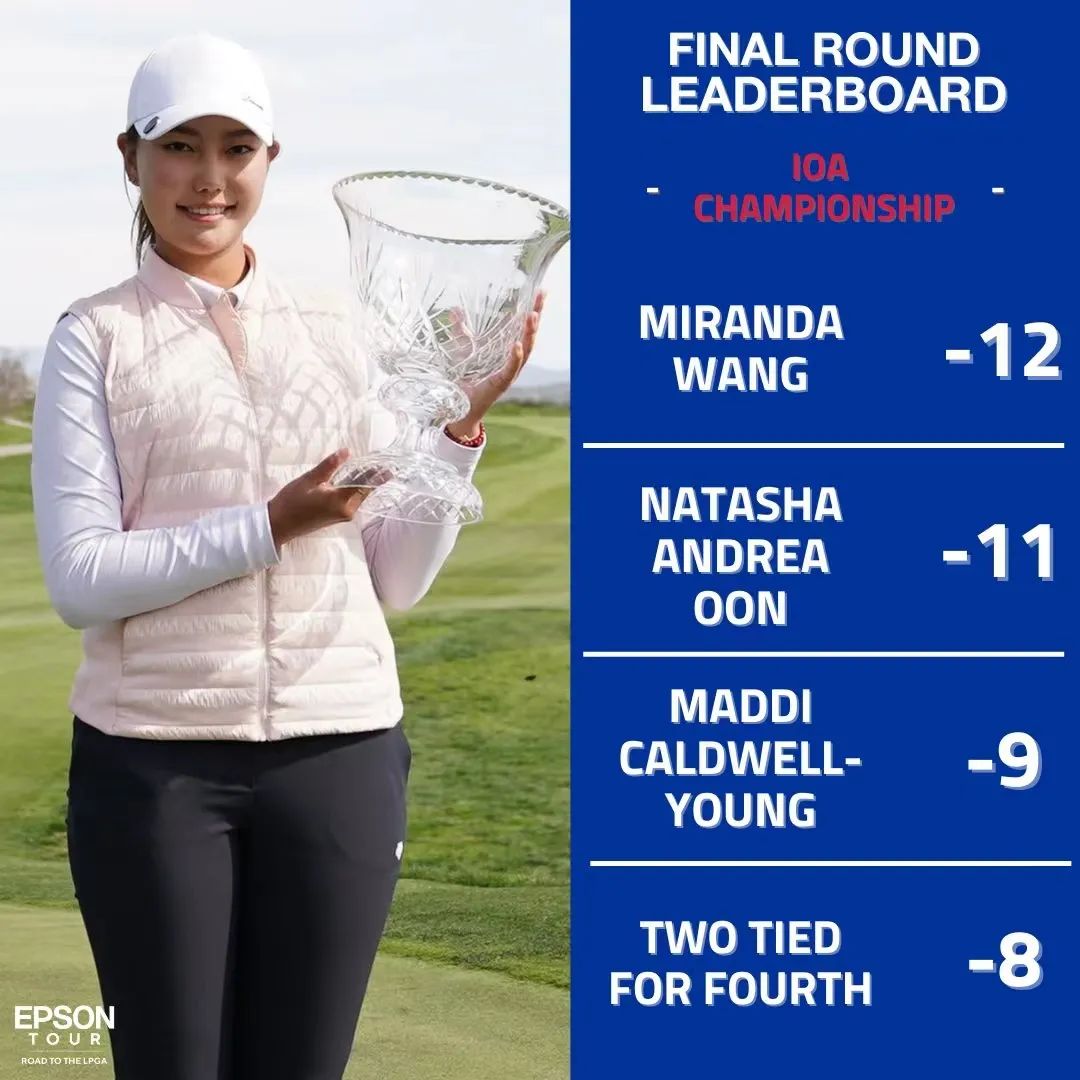 女子美巡具有最高的世界积分,能够直升女子美巡的二级赛以竞争激烈著称。王馨迎今年新加入爱普生巡回赛,她在最后一轮中顶住马来西亚选手娜塔莎·安吉雅·昂的压力,打出70杆,三轮成绩为204杆,低于标准杆12杆,领先1杆夺冠。